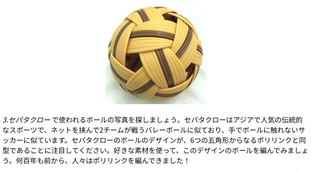・ その時に参照した pdf を改めて見直していると,最後のあたりに 『セパタクローのボールのデザインが、6つの五角形からなるポリリンクと同型である…』との記述があります。
