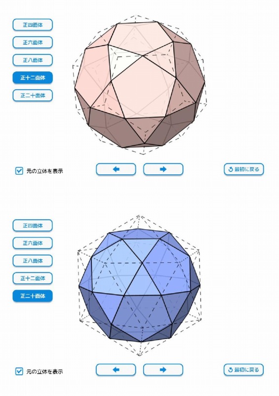 二十・十二面体も切頂二十面体(サッカーボール)も,正十二面体と正二十面体の切頂(trancation)の途中に現れます。