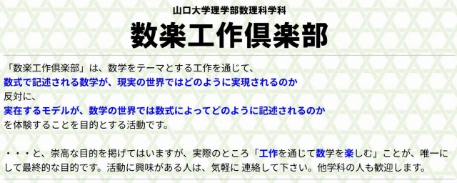 ・「数楽工作俱楽部」のページのトップには「工作を通じて数学を楽しむ」のことばが掲げてあります。各ページにはたくさんの画像とともに作り方の詳しい解説が載っています。