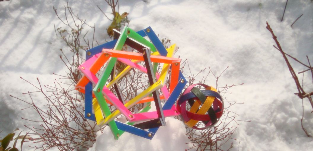 ・ 先頭図は先に作った『Six-Pentagons Polylink』と最初に作った6色の『Sepak takraw ball』です。年初の雪の日からずっと『セパタクローボール・二十・十二面体・星籠(スターケージ)・ポリリンク』のことを考えています。