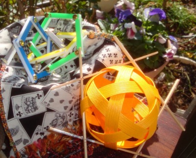 ❷のセパタクローボールは何個か作った作品の再活用。新たに買い足したヒノキ材を大雑把なサイズで切って組んでみます。この時思いついたのは