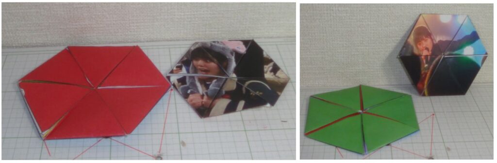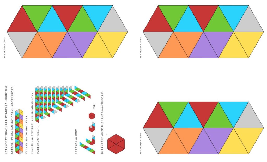 「フレキサゴンで遊ぶ」には「切り抜き用PDF1〜4」に続いて「6面用PDF、折り方付き」がありました。作り始めるまで不安がありましたが,いざスタートしてみると『案ずるより産むがやすし』で,作り方の図に大いに助けられました。