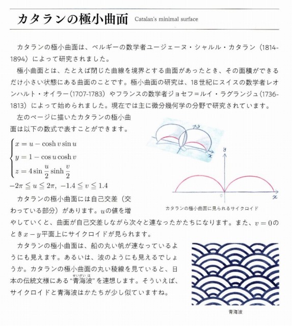 著者は瑞慶山香佳氏,”数学デッサン”や数学をモチーフにした作品を制作する美術作家だそうです。第3章で「カタランの極小曲面の丸い稜線を見ていると、日本の伝統文様にある”青海波”を連想する」と書いておられます。