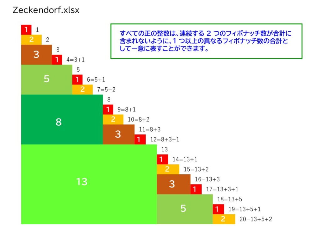 「フィボナッチ数列の8つの性質(一般項・黄金比・互いに素)」の中に「ゼッケンドルフの定理とその証明」というページがあります。先ごろ著作を借りて帰りました。