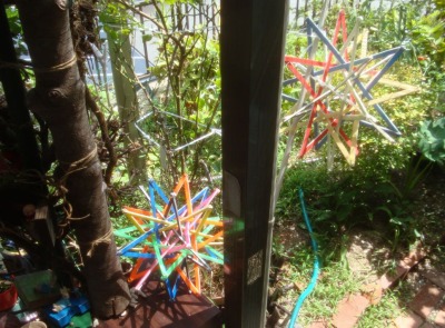 天井に吊るしてあった2004年の作品を下ろします。幅15ミリメートル×長さ510ミリメートルの発泡スチロール。どういう訳でこの幅と長さになったのか記録がありません。吉野杉内装パネリング(9mm×95mm×1900mm)《2800mmでした!》もペンキを塗ってボルトで止めただけだったような…。今回はやや小さめの三分の二サイズを目指します。星が絡み合う…旧作があるとはいえ結構難しいです。