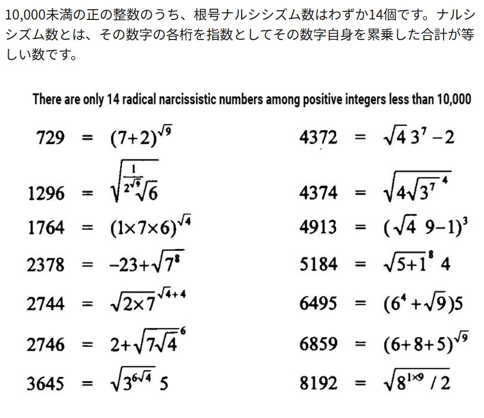 ❷ 関連して『Radical Narcissistic Numbers (COLIN ROSE)』で
